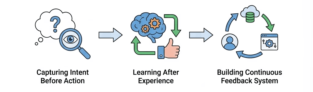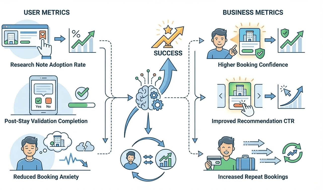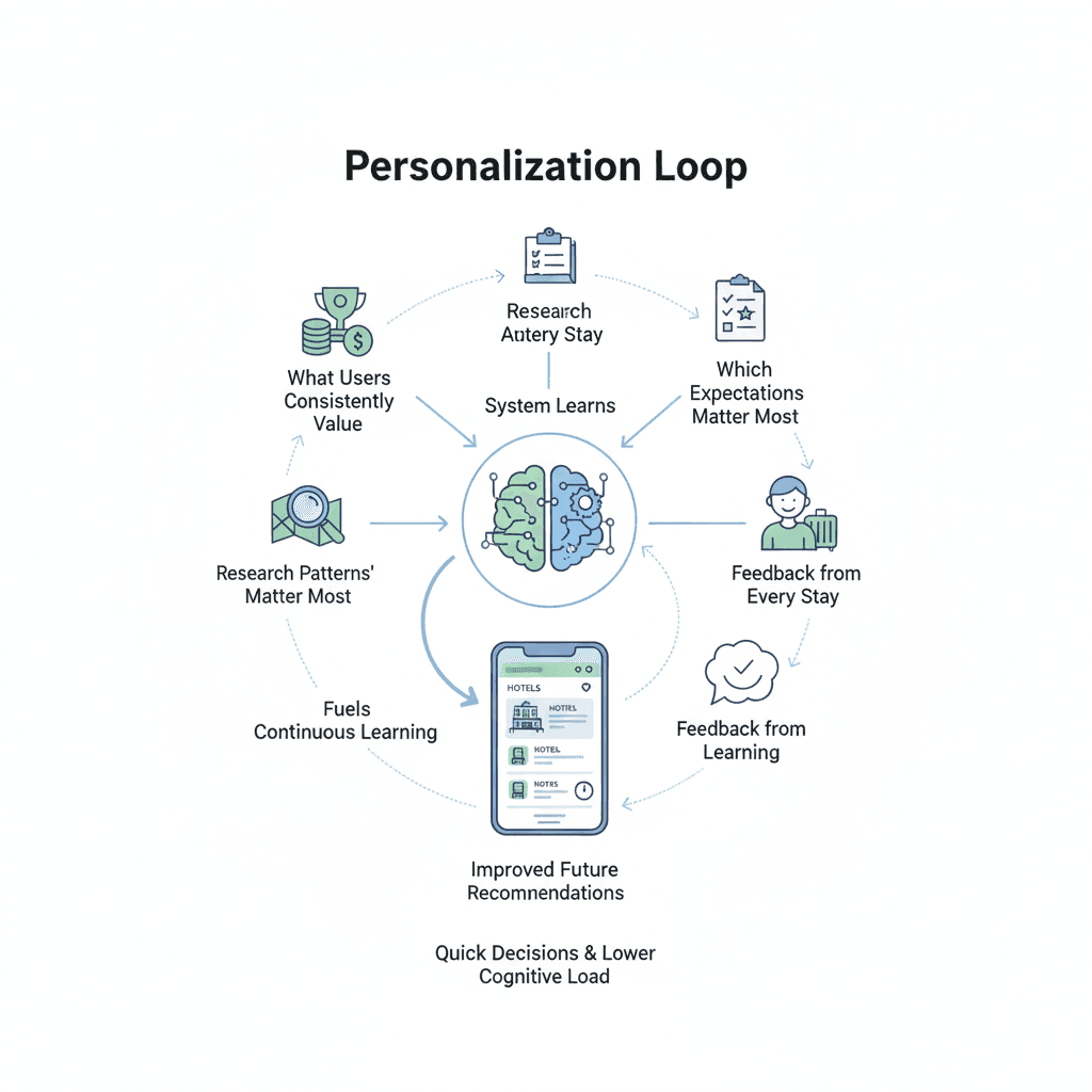 Instead of optimizing only for conversion, the design captures user intent before action, learns from real experiences after the stay, and connects both through a continuous feedback loop.