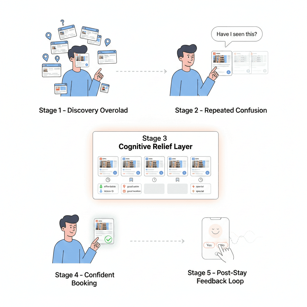 Hotel booking apps don’t help users remember their decision-making. This leads to confusion, repeated browsing, forgotten preferences and poorly matched stays.